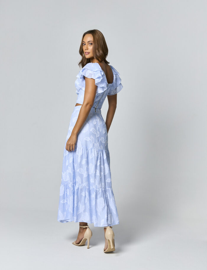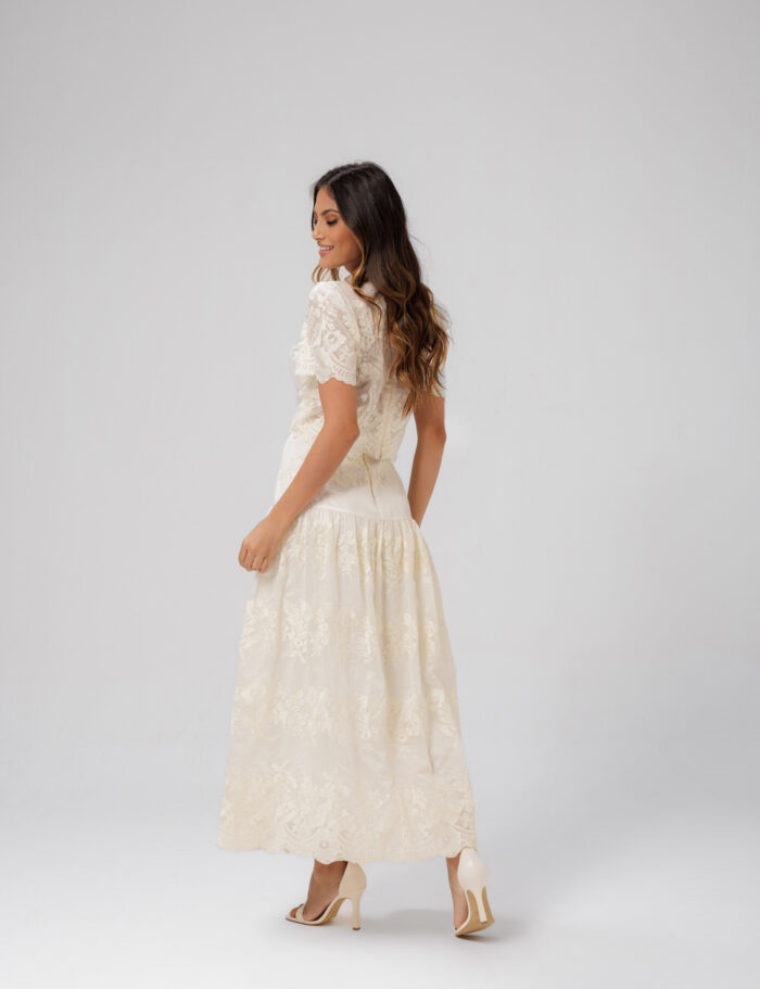 Conjunto Saia Midi E Cropped Com Renda E Tecido Trabalhado
