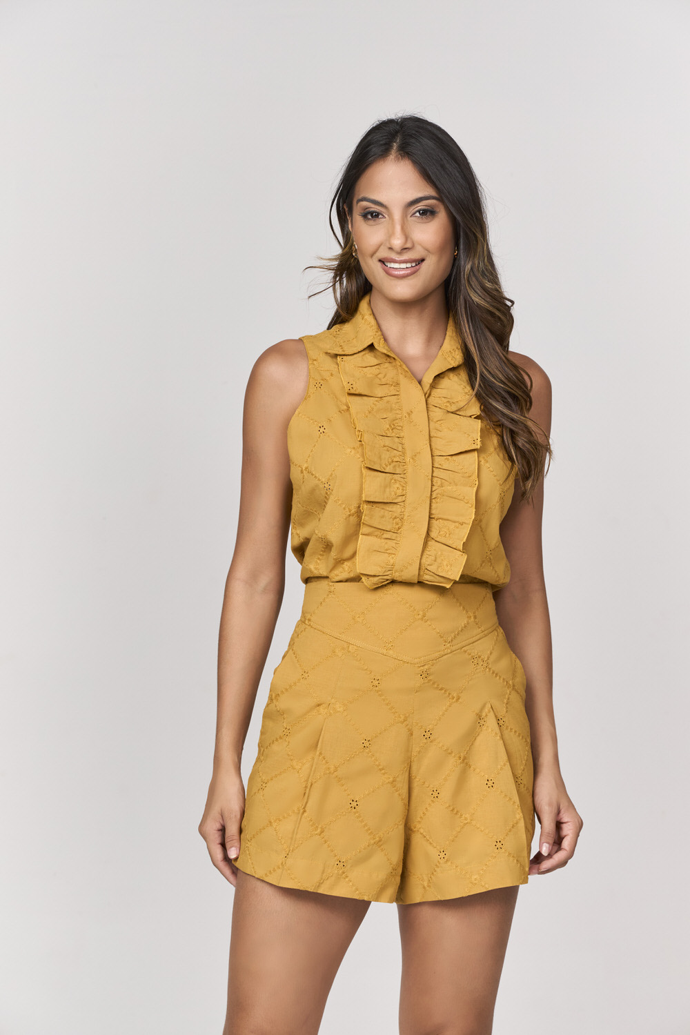 Regata em tecido de fibra artificial e algodão. Possui modelagem levemente fluida, trabalhada em laise. Tecido possui bordado maquinetado.