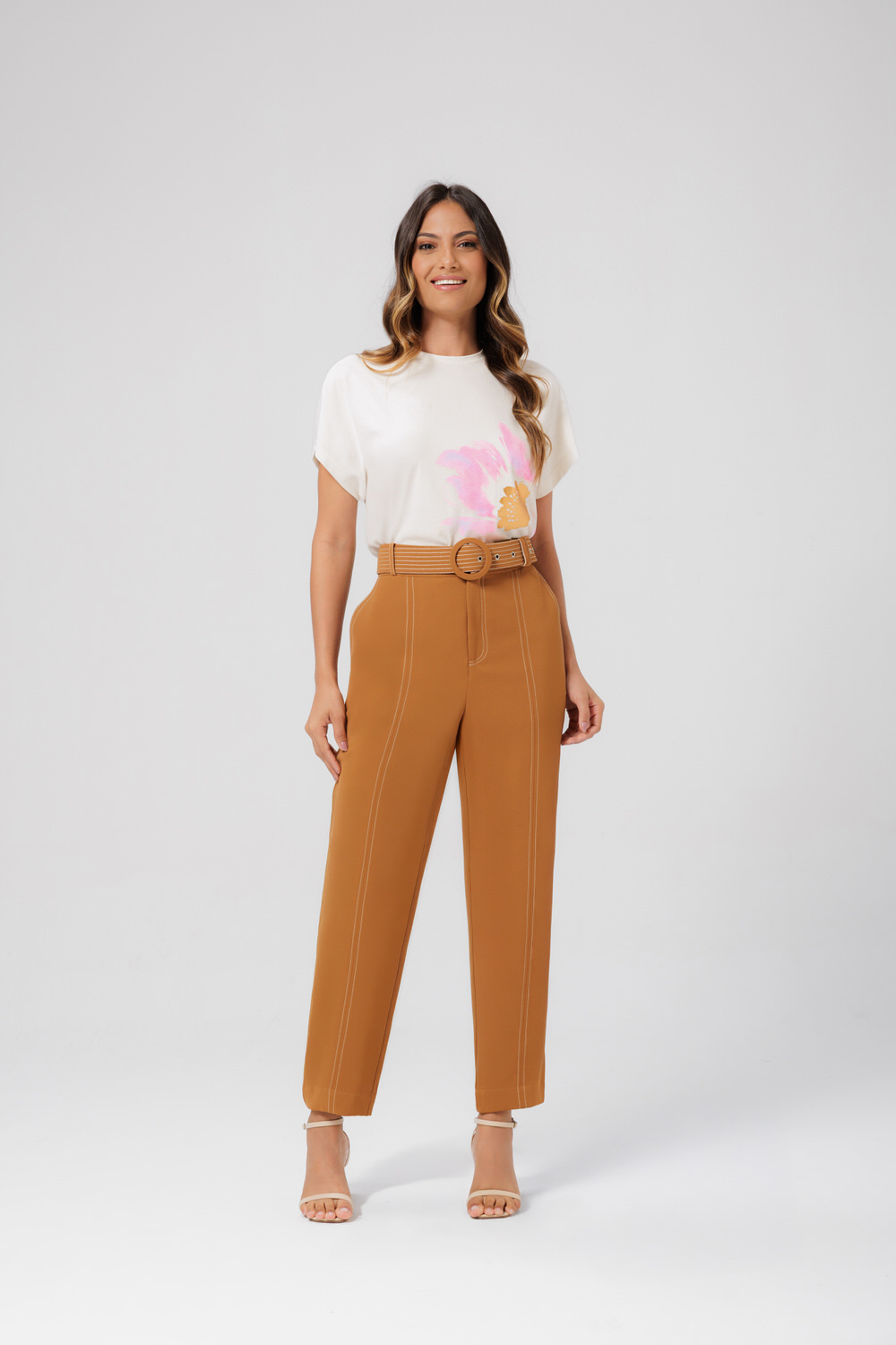 T-shirt em viscose e elastano, possui mangas evas? e aplica??o de estampa exclusiva localizada em silk.