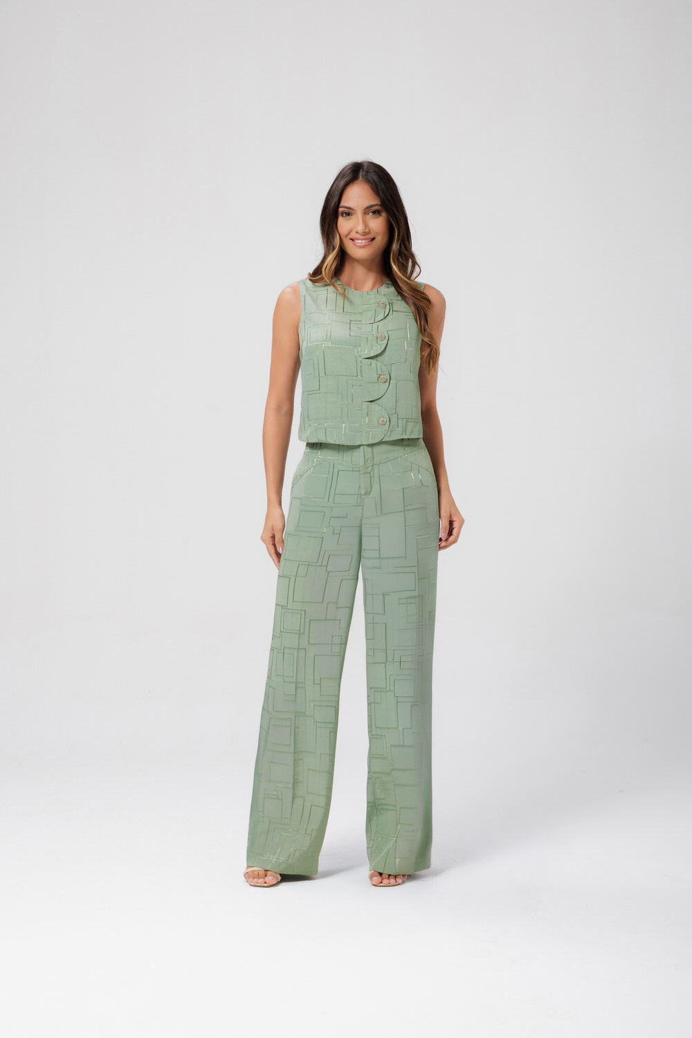 Conjunto em viscose, composto por cropped e cal?a pantalona. Elegante com caimento leve e detalhes que valorizam o busto na medida certa. Tecido possui detalhes com leve brilho. Ideal para compor produ??es com charme e sofistica??o.