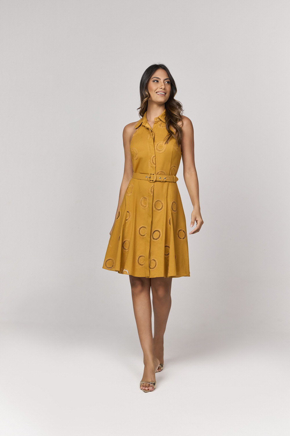 Vestido em tecido de fibra artificial e algodão. Possui modelagem curta, decote em “V”, tecido possui bordado trabalhado. Acompanha cinto coberto de mesmo material.