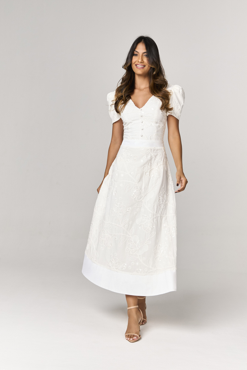 Descubra a elegância e o charme de nosso Vestido Midi com Detalhe Bordados, uma peça que combina sofisticação e modernidade, ideal para ocasiões especiais e momentos memoráveis. Este vestido foi elaborado com um toque refinado, oferecendo um caimento perfeito que valoriza a silhueta feminina.