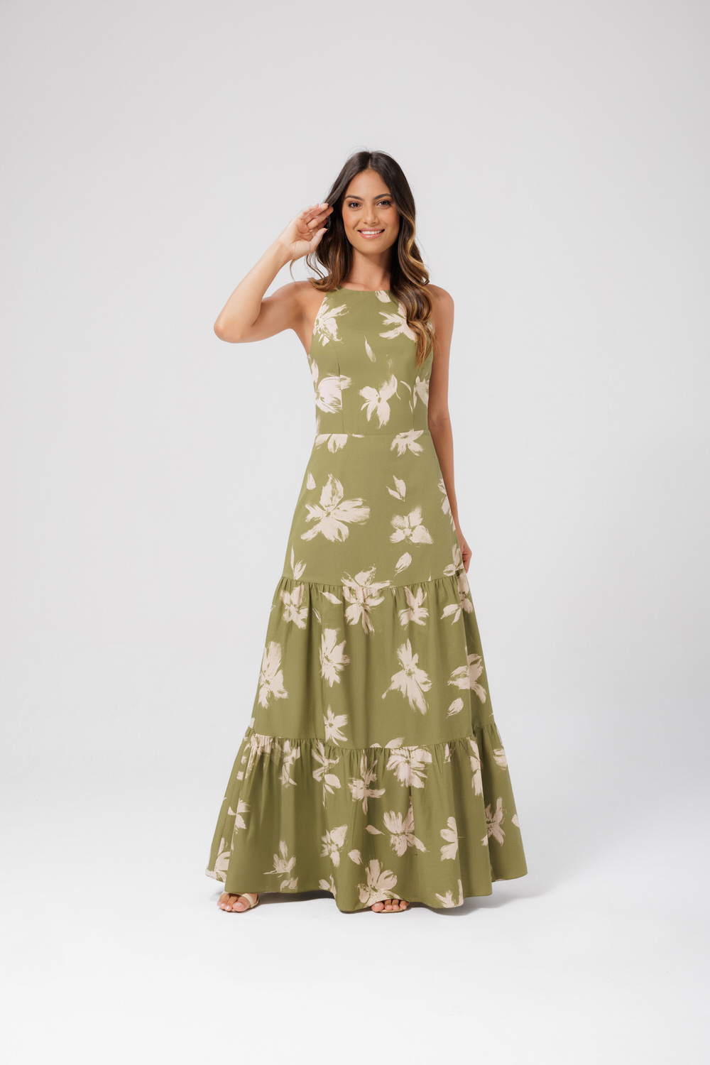 Vestido com estamparia exclusiva em tricoline. Possui comprimento longo, recortes frontais no busto, fechamento por z?per nas costas, caimento evas? e aplica??o de babados na saia.